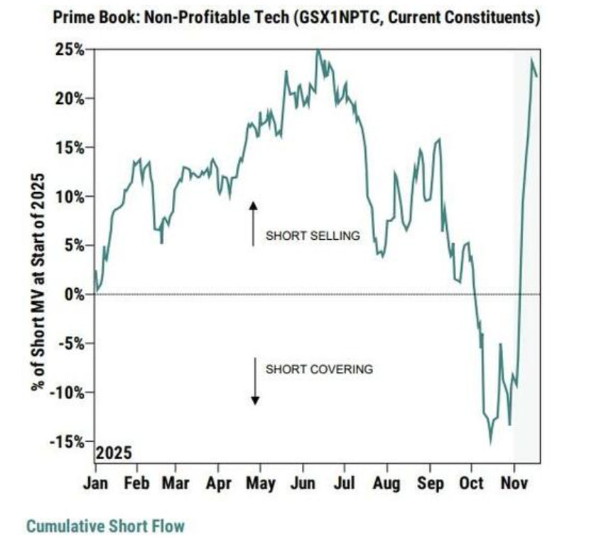 报告指出,调整主要体现在市场内部结构上。例如,高盛无利可图科技指数(GSXUNPTC)从高点到低点下跌了约23%,做空最多的股票投资组合(GSXUMSAL)下跌了约29%。